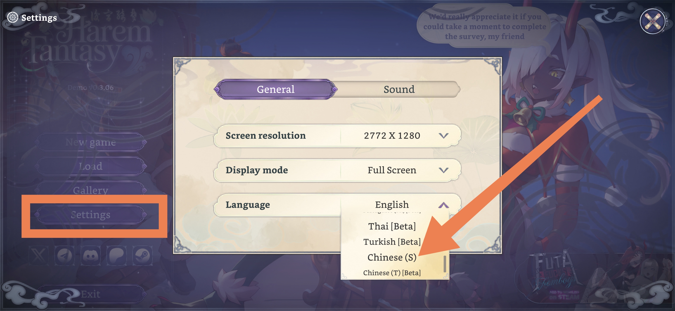 设置中文:打开设置(Setting)将语言(Language)更改为Chinese(S)。游戏介绍:你将扮演帝国后宫的一名宫廷治疗师,置身于美女如云、阴谋诡计层出不穷的后宫之中。在天朝的中心,你将扮演治疗师、诱惑者、揭开重重阴谋,在激情与背叛的漩涡中求生。