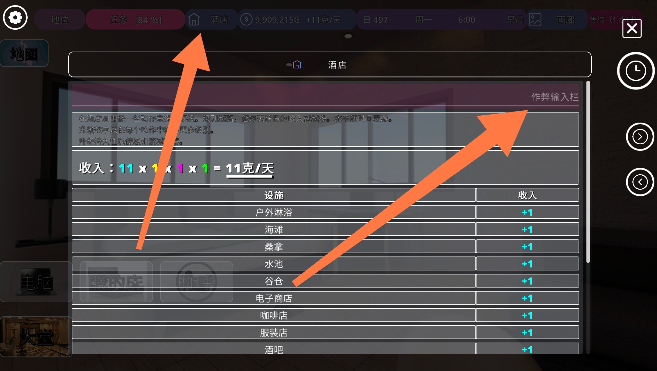 注意:游戏内点击酒店在作弊输入栏输入。